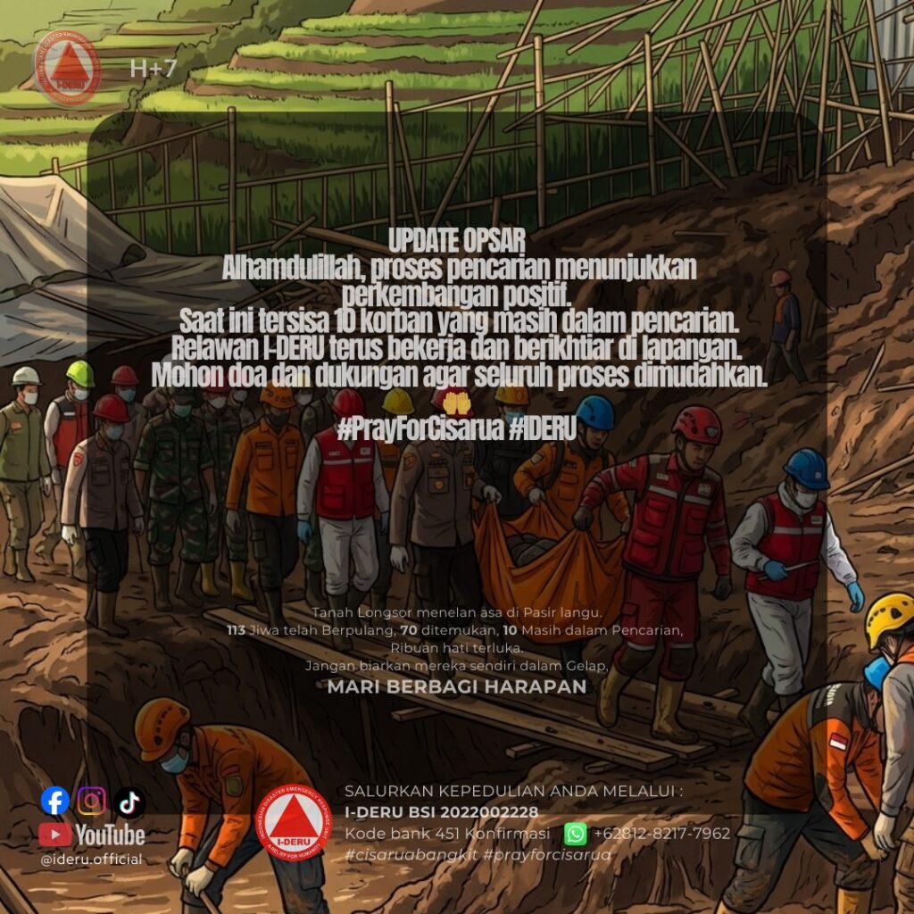 Memasuki hari ketujuh Bencana Tanah Longsor Cisarua Bandung, Tim IDERU kembali menjalankan tugas sejak pagi hingga sore hari, Sabtu, 31 Januari 2026, pukul 07.00 hingga 16.30 WIB.